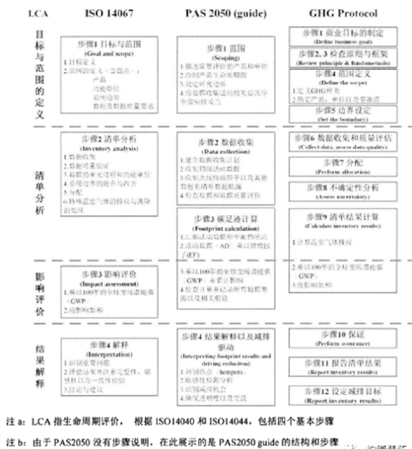 PAS2050guide和GHGProtocol两个标准则是将生命周期评价的步骤的位置、一些相对宽泛的术语和概念进行了一些调整与修改,使其更加直观明确,并有利于针对产品碳足迹评价的实际操作与执行。PAS2050guide重新划分评价步骤,从清单分析环节将数据收集以及其质量控制的内容剥离出来,单独成章;而清单分析中的剩下的排放计算以及后一步的影响评价则被合并为一个步骤——“碳足迹计算”,名称上更简单清晰和具体,同时如此划分也更利于对于计算环节的指导。GHGProtocol则是在步骤上的划分更加细致清晰,将产品碳足迹的核算工作所需处理的重点环节一步一步展开,一共分成了12个步骤,每一个步骤再配以具体的规定和详细的图例进行阐述和指导。