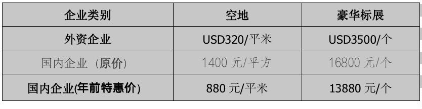 | 国内企业(年前特惠价) | 880元/平米 | 13880元/个 |