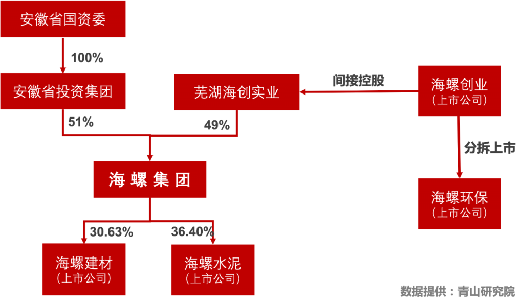 改制后,安徽省投资集团持有51%股份,海创公司拥有49%的股权,这是一家由工会在Caymen小岛上创建的控股公司,通过国内一系列子公司对海螺集团进行控股,2013年在香港联交所上市。