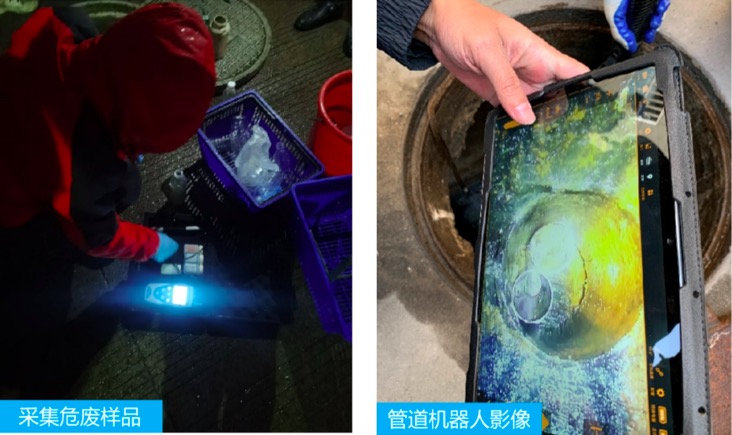 该污水厂服务区域为工业园区,内部企业有上百家,行业性质复杂多样,管网走向纵横交错。执法人员通过线上查阅环评文件、排污许可证、在线监测等非现场调查,将目标企业锁定在四家涉及酸洗的企业;同时利用管道机器人,对4家企业周边管网开展巡检,最终发现宁波市镇海新亮丽电泳涂装有限公司(下称新亮丽公司)厂区外1#污水井存在高浓度酸水残留及排放,在2个小时内就迅速锁定了废水来源。执法人员对1#污水井管道内残液、新亮丽公司污水站水泵入口废水、污水排放池内残留废水进行比对,发现这三处废水均呈强酸性。